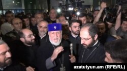Վերջին երկու շաբաթում վարչապետ Փաշինյանն ամենօրյա գրառումներով ու երեկվանից արդեն կոնկրետ համակարգող խմբի ձևավորմամբ կաթողիկոսական նոր ընտրություններ է ձեռնարկում: Կաթողիկոսն ինքը այս թեմայով լրագրողների հարցերին չպատասխանեց, սակայն ժամանման սրահից դուրս եկավ՝ հավաքվածների ծափերն ու կոչը նրան ստիպեցին կանգ առնել մեքենայի մոտ. - «Վե-հա-փա՛ռ, Վե-հա-փա՛ռ, Վե-հա-փա՛ռ», «Վեհափա՛ռ, զավակներդ են եկել դիմավորելու»: